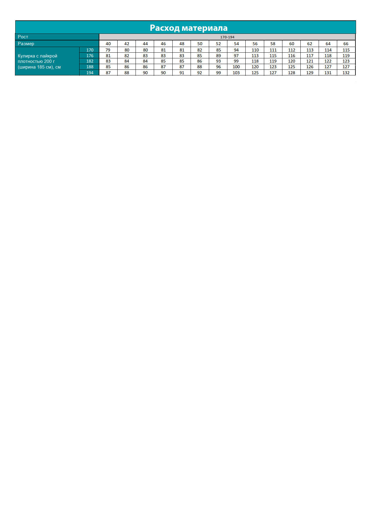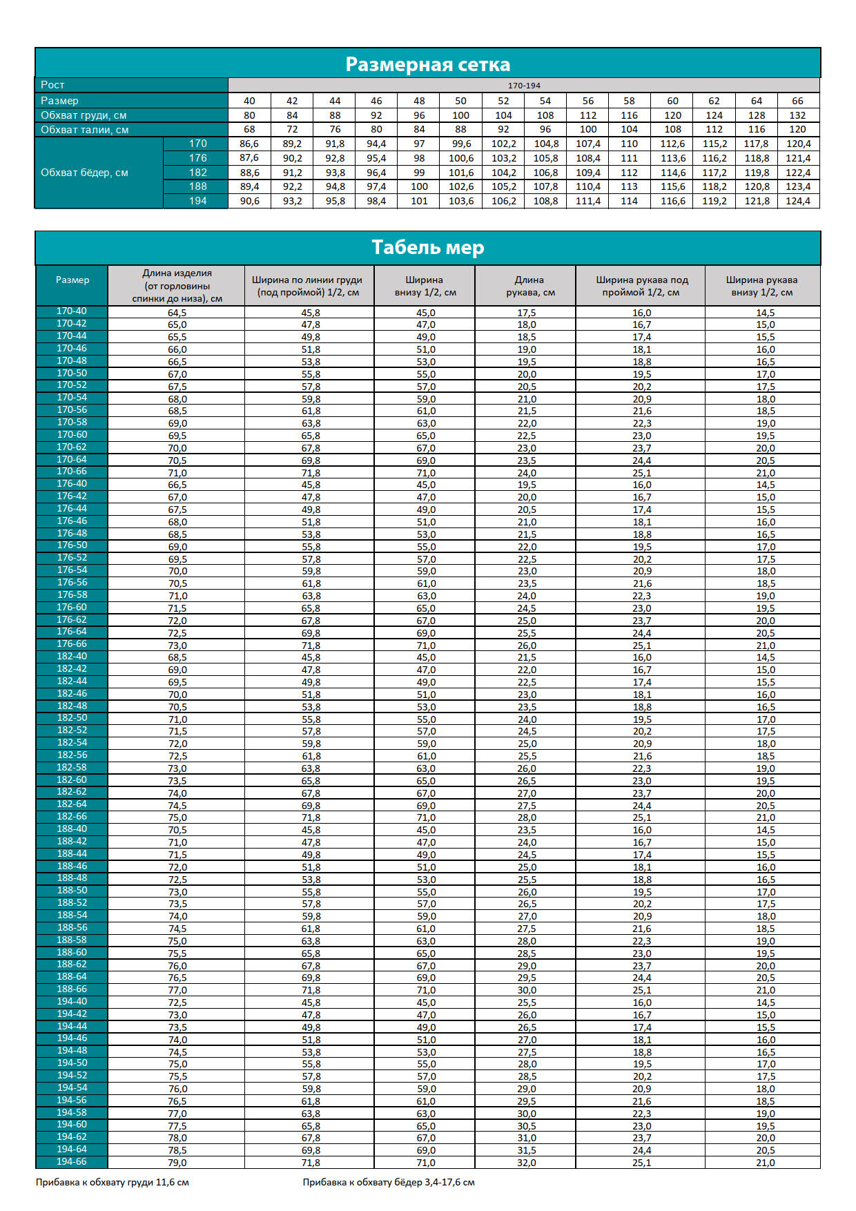 Размеры 40-66 на рост 170, 176, 182, 188, 194