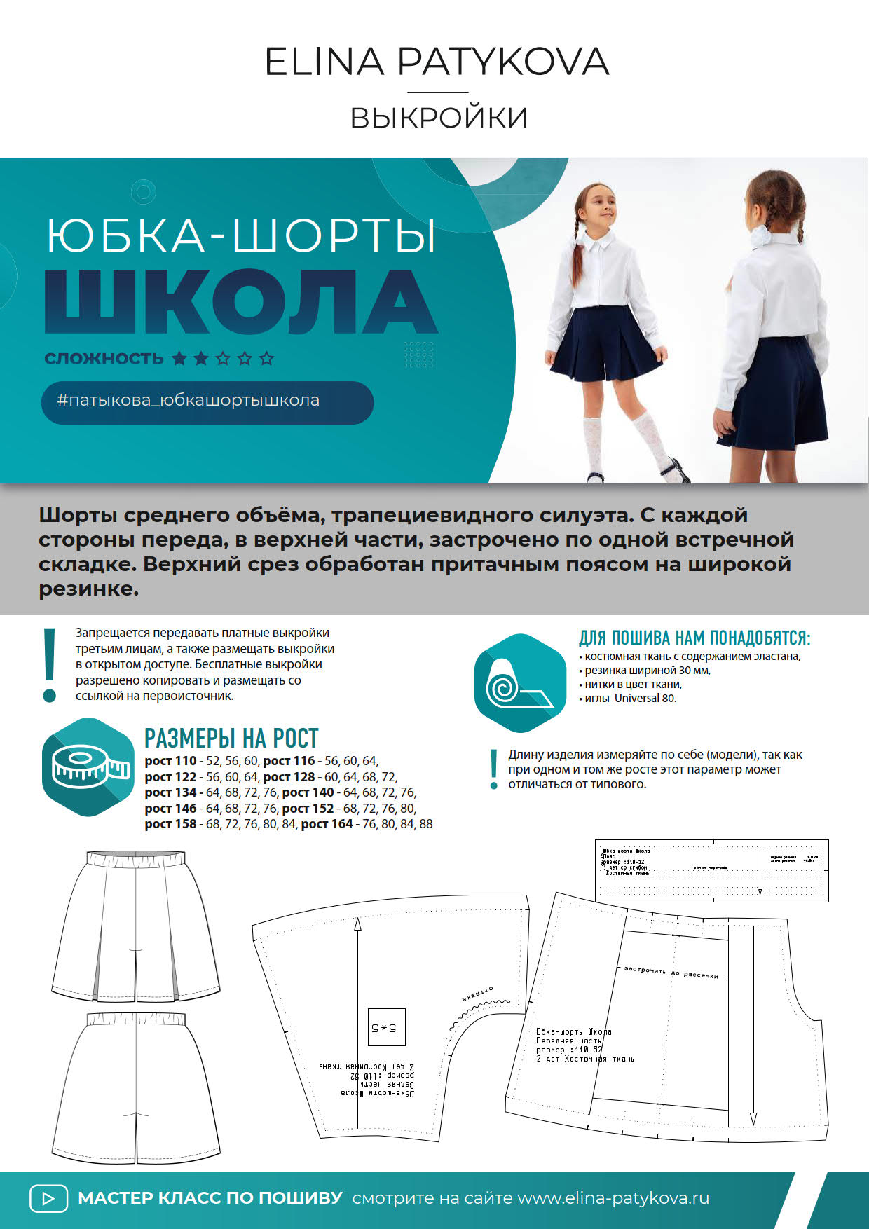 - Обращаем ваше внимание на то, что выкройка юбки-шорт Школа разработана для эластичных материалов (т.е. материалов с содержанием эластана)