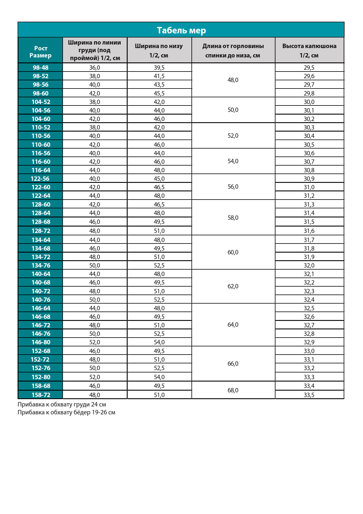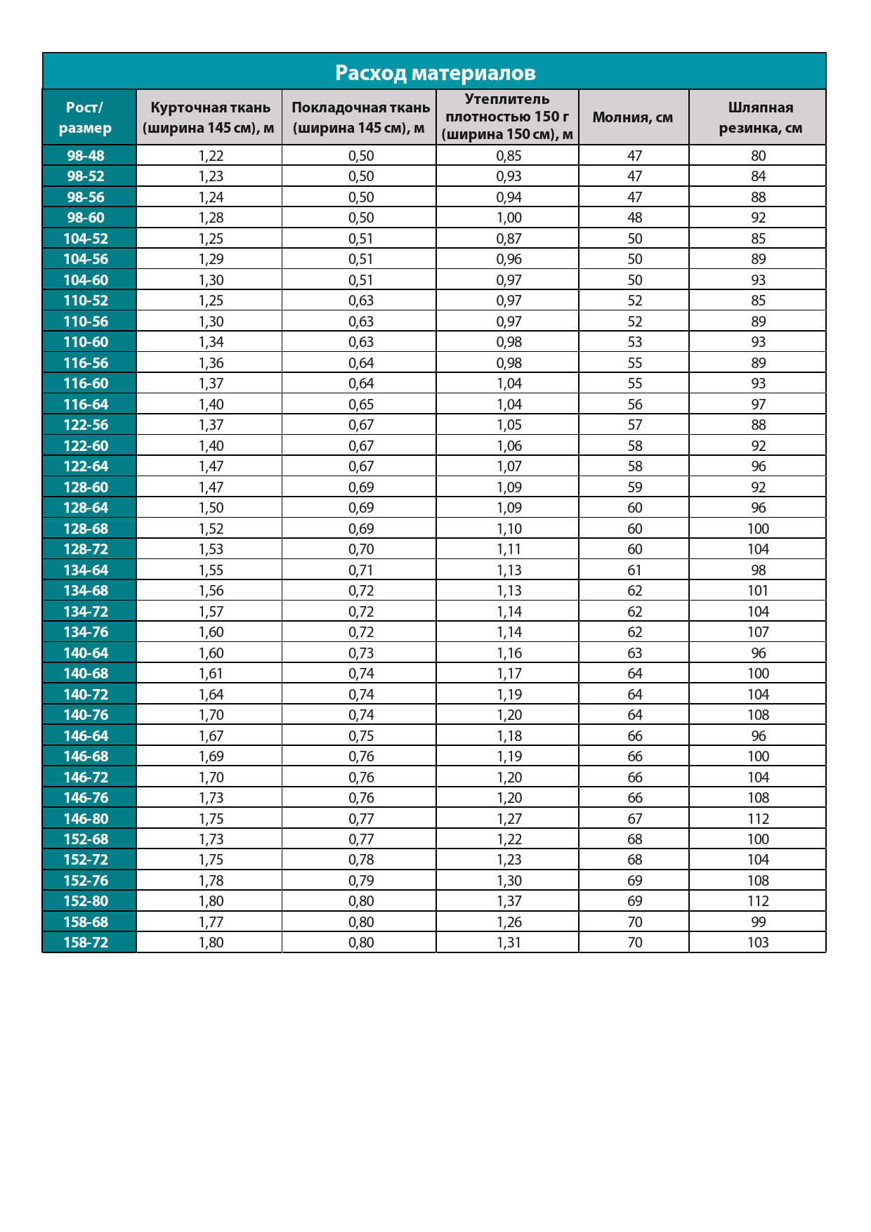 Размерная сетка, расход ткани, табель мер — в галерее